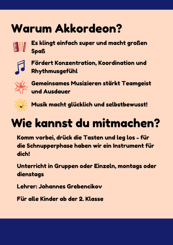 Du möchtest Akkordeon lernen oder in einem unserer Orchester mitspielen? Du hast schonmal Akkordeon gespielt oder willst es einmal ausprobieren? Dann melde dich einfach bei unserem Dirigenten und musikalischen Leiter Johannes.